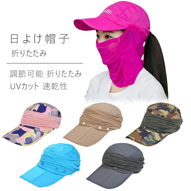 日よけ帽子 フェイスマスク フェイスカバー ネックカバー 薄地 帽子 通気 速乾性 日焼け防止 UVカット 紫外線対策 レディース アウトドア 取り外し 調節可能 折りたたみ